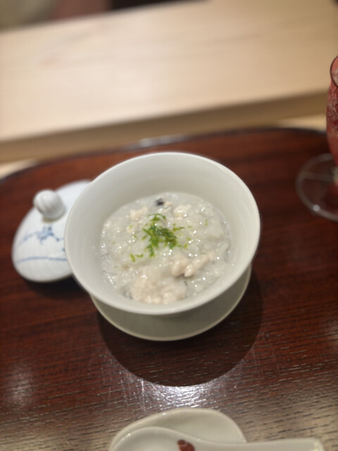 白子のお粥は、始めに炭焼きした白子をレア状態で、お粥に。