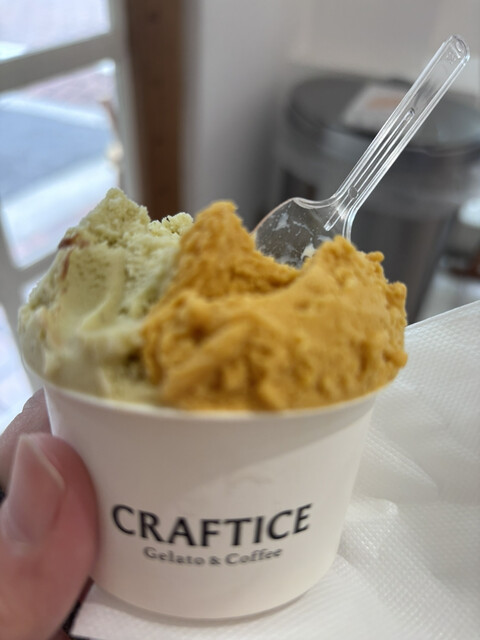 前回おじゃましたときとジェラートメニューが少し変わって、季節を感じられるものもあり、悩みに悩みましたが、私の中で安定の ピスタチオ、そして初のロイヤルミルクティーを選びました