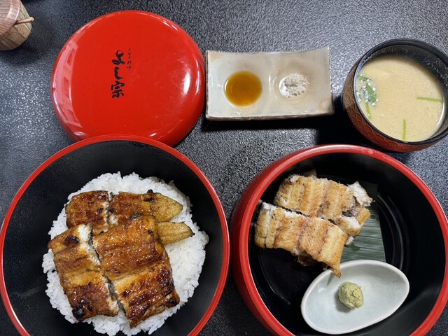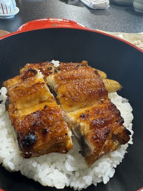 入れ物がホント赤いダルマのようで2段になって、白焼と鰻丼の食べ比べ。身は蒸しで、フカフカで柔らかくて美味しかったです◎一切れが大きい◎