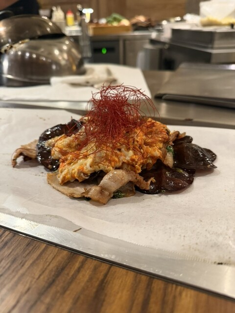 ■ 体験価値と空間 最も魅力的なのは、やはり目の前で繰り広げられる鉄板上のライブパフォーマンスです。料理が出来上がっていく過程を堪能できるため、予約の際はぜひカウンター席をリクエストしてください。ウェルカムカードやお通しの山芋など、細部にまで非日常を演出する心遣いが見られます。