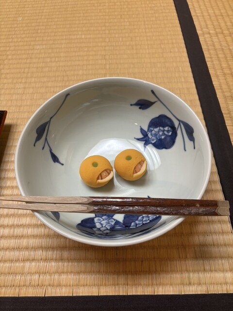 お稽古日の前日に主菓子を買い忘れたので伺いました。リアリティあるみかんの練り切り!中はこし餡にみかんピールが効いた美味しい餡でした。