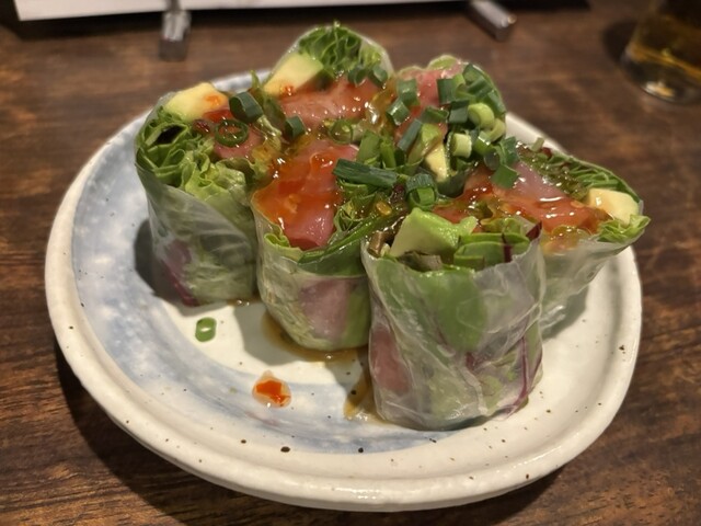 天然本マグロ刺し、生ホタルイカ刺し、かつおの刺身や筍の天ぷらをいただきました。