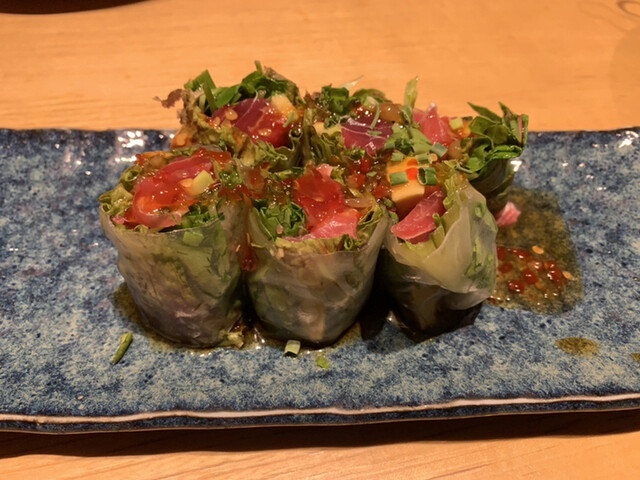 マグロとアボガドの組み合わせは味も食感も最高。ごま油と合わせるとさらに最高。最近ハマっている奄美黒糖焼酎の中から竜宮をいただきました。黒糖焼酎の絶妙な香りと味わい。