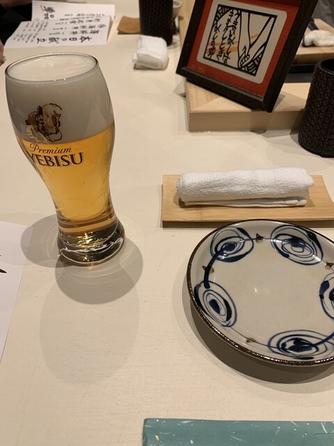 最初はエビスの生ビール、その後刺身盛り合わせに合わせたくて日本酒をいただきました。