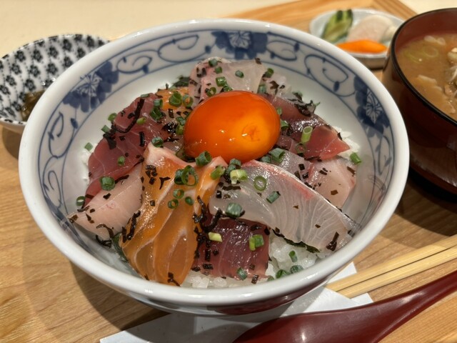 満席だから少し待っていると、塩出汁に漬けられたお刺身がご飯の上に盛られ、生玉子の黄身が添えられた「塩 海鮮丼」が登場。マグロ、サーモン、鰆、ブリかな?刺身だけで食べても美味しいし、玉子と合わせると濃厚だし、レモンを絞ると爽やかに。味変できて素晴らしい。
