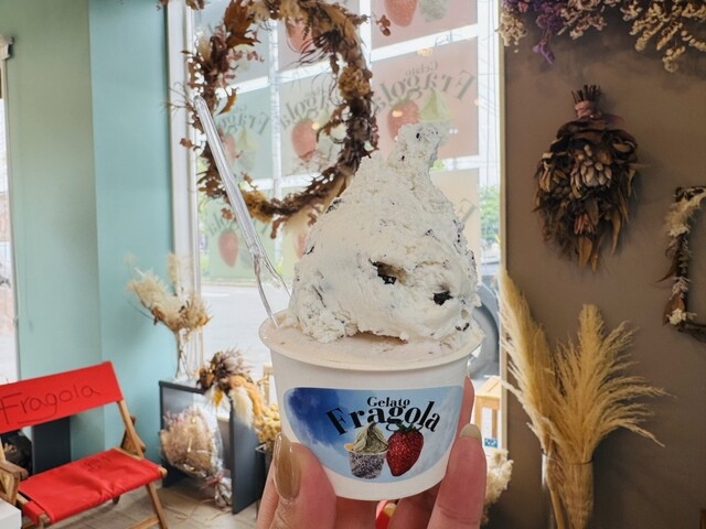 ジェラートはミルクチョコミントとイチゴマスカルポーネ。チョコミントが色が白くて驚きました。でもしっかりハーブのミント、本物の香りで癒しも与えてくれます。美味しすぎでした。