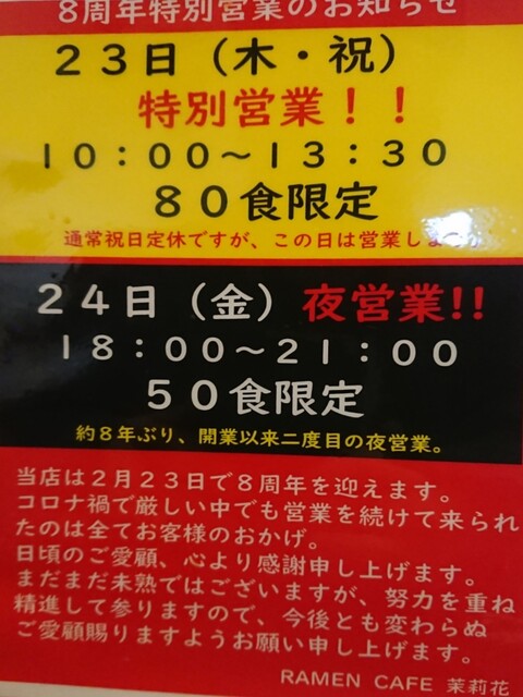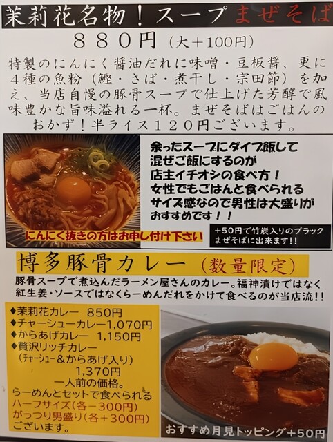 こちらのメインとなる店舗さんである、博多豚骨ラーメン専門店→RAMEN CAFÉ 茉莉花