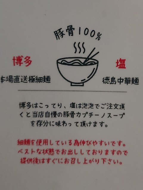 豚骨ラーメンと油そばの2枚看板を扱う、ラーメン屋さんの作る、限定メニューの徳島ラーメンは、レギュラーメニューの豚骨ラーメンの良さを残した、他の店舗さんとは違う味でした。