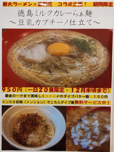 こちらの店舗さんは人気はありますが、あまりメディア等にも出る事は少なく、ましてや他店とのコラボは非常に珍しいですが、徳島で圧倒的な知名度を誇る徳島ラーメンの有名店の、東大とのコラボメニューと聞きつけたからには、行かない訳がありません。