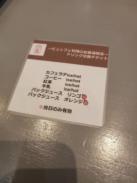 最初にレジでビュッフェ希望の旨を伝えると、そこで料金を支払い、ドリンクを注文、追加ドリンクのチケットとパン取り皿を貰って、席へ案内されます。