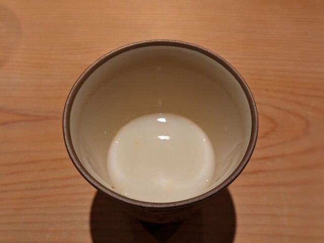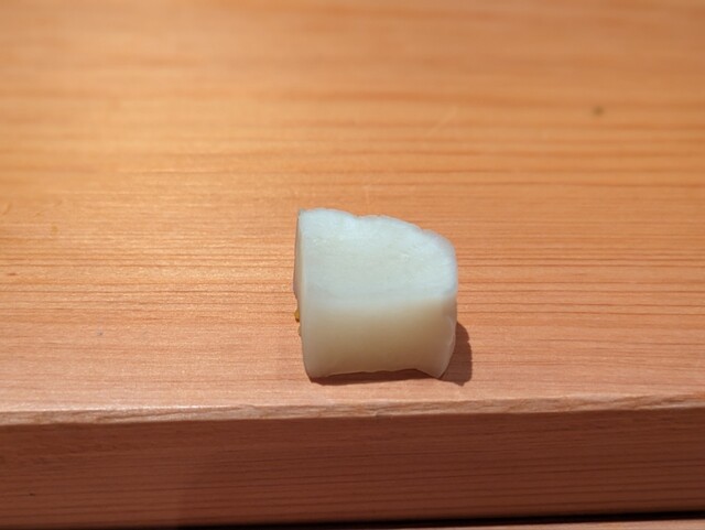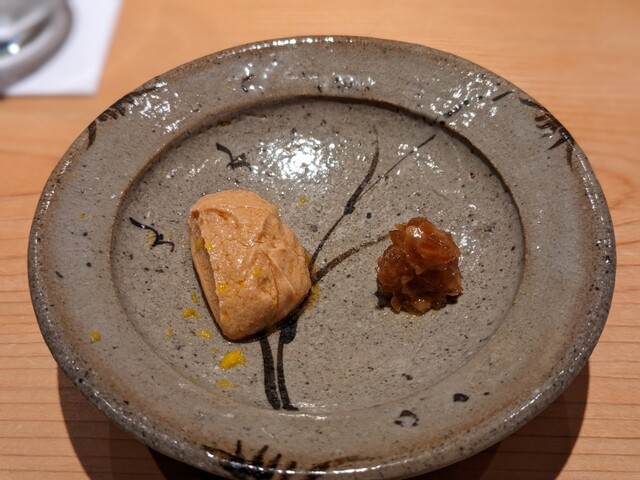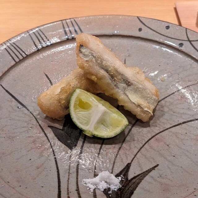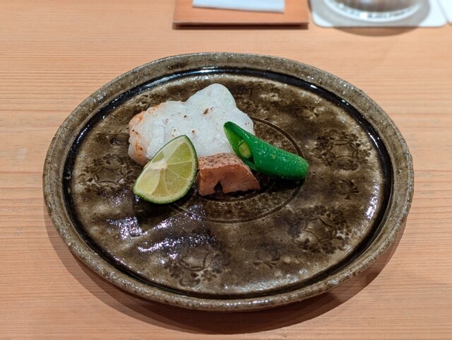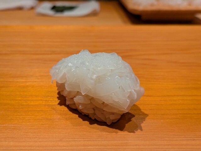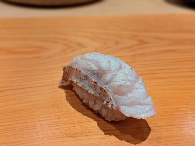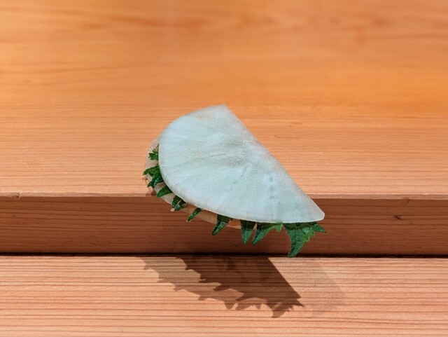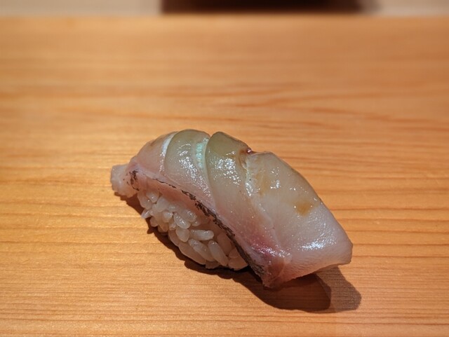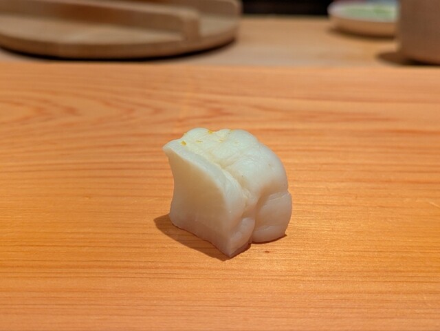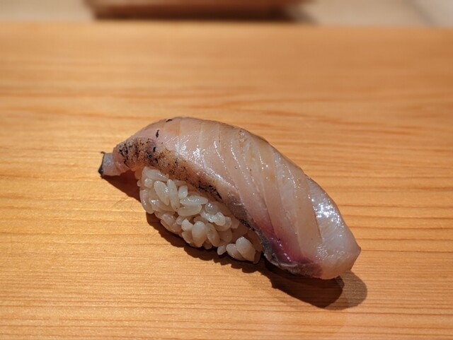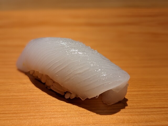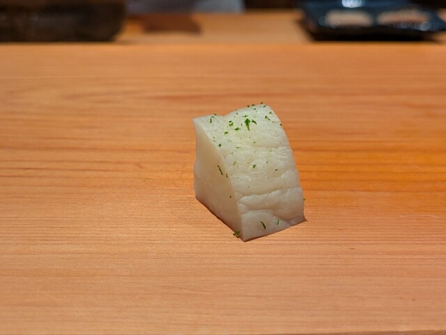 シャリとネタの間に青柚子を挟んでいる。塩で。