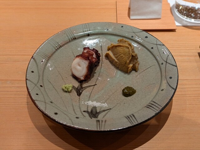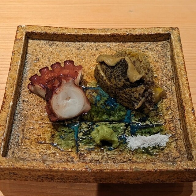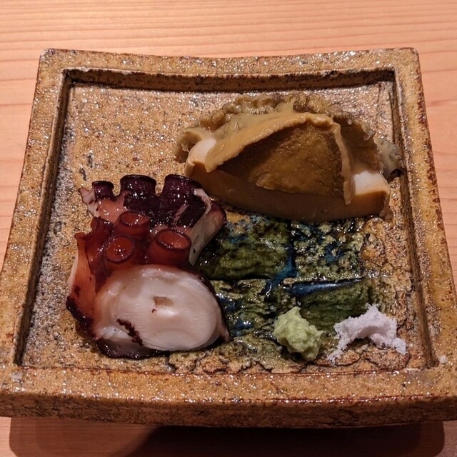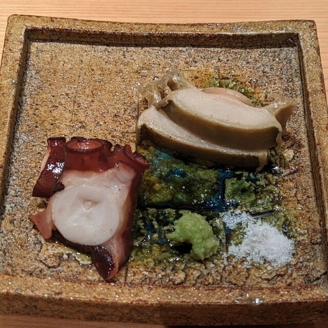 蛸は塩とワサビで。鮑は塩とワサビor肝ソースで。