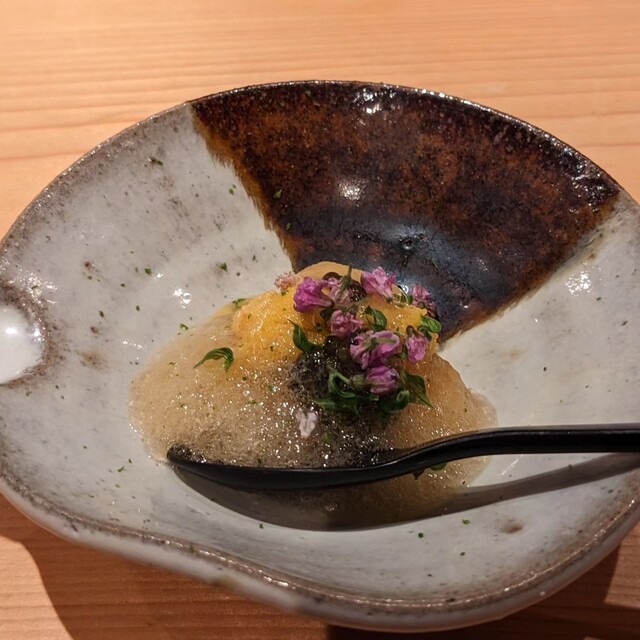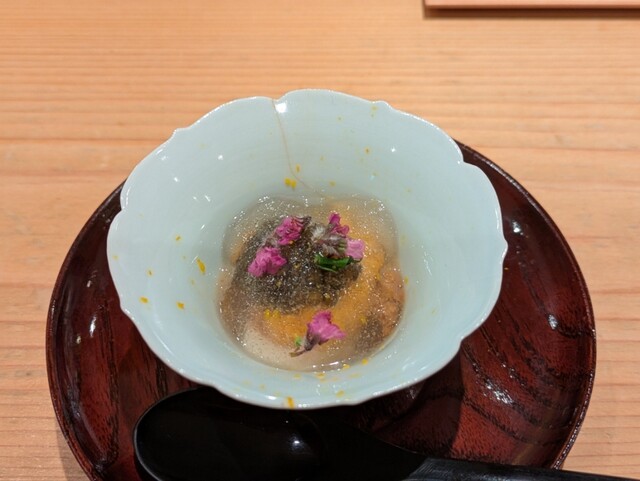 上にサロマ湖のバフンウニとキャビアと出汁のジュレソースを乗せて