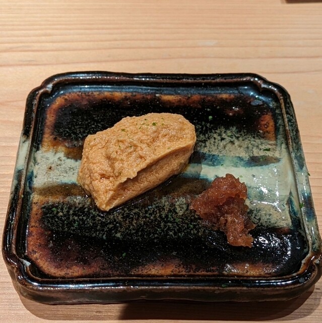 ミョウバンを使っていない塩水ウニ。キャビア乗せ。