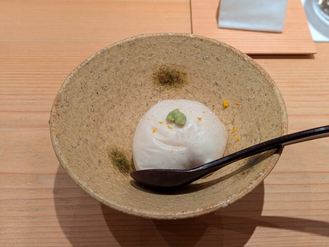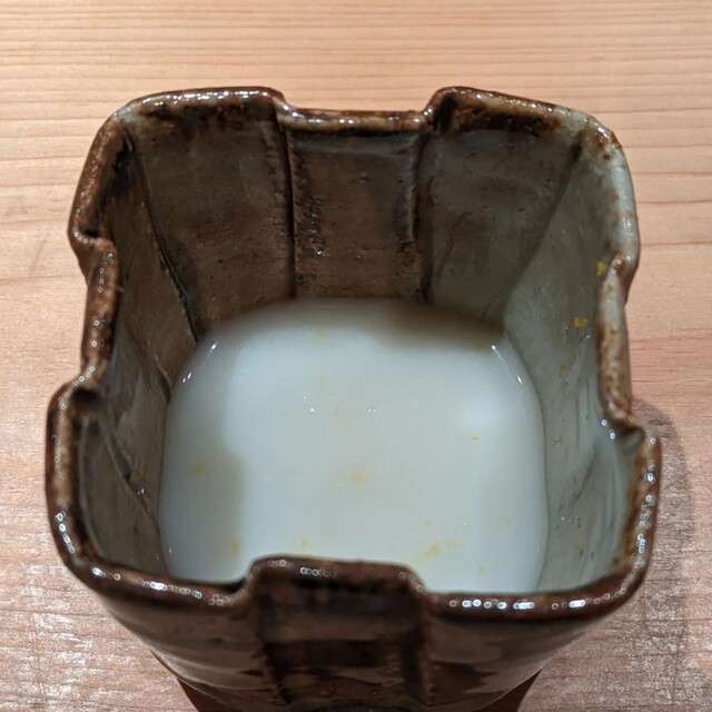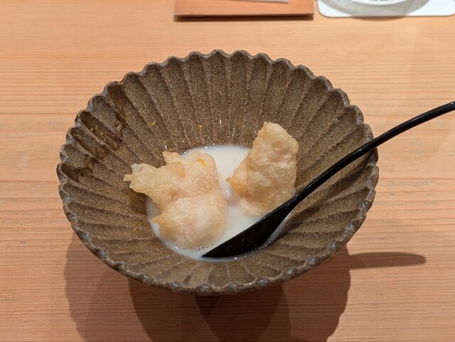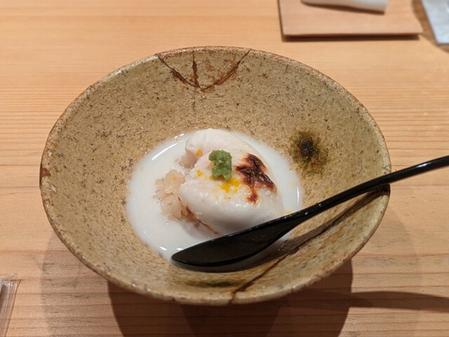 鰹出汁を混ぜた白子のソースで。下にシャリ。