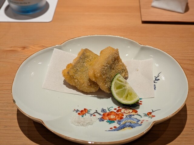 魚体29キロ。茨城県産のひかりれんこんと豊橋産のスナップエンドウの素揚げを添えて。