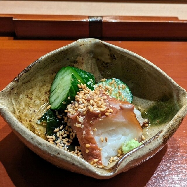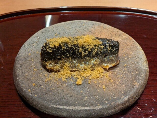 カマスは塩締めして皮目をさっと炙ったもの。下に茶ぶりした海鼠。途中で柚子の蓋を絞って味変を。