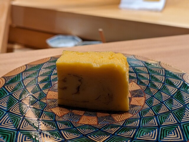宮崎県産地鶏の卵を使っている。カリフラワーの摺り流しをかけて。串間のムラサキウニを乗せて。