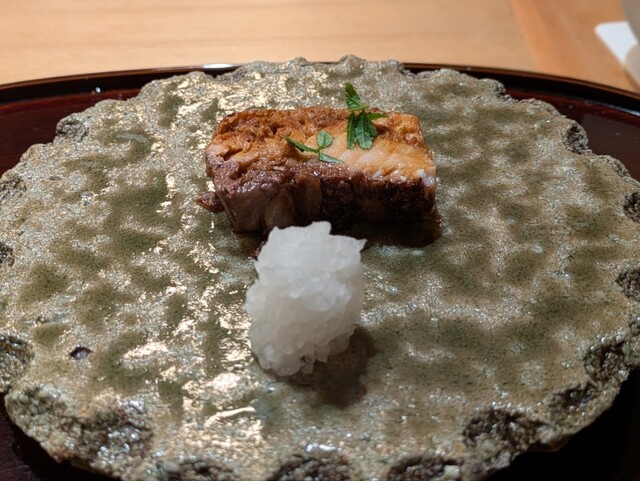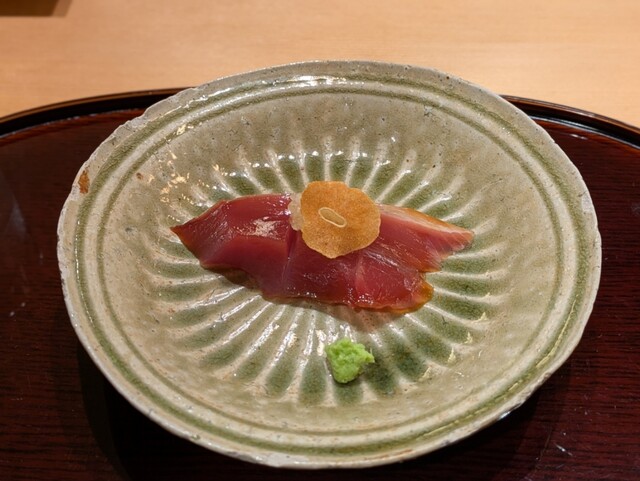 宮崎の甘い醤油に漬けて、藁でさっと燻したもの。日南レモンの果汁に漬けた新玉ねぎとニンニクチップを乗せて。