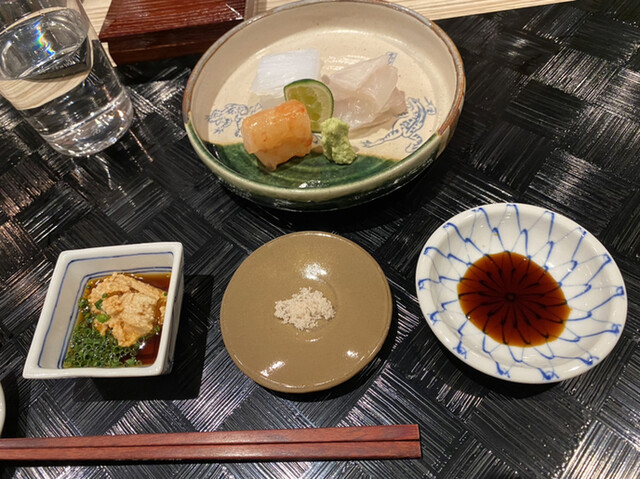 鯛お刺身? 余市鮟肝 大根おろしと浅葱