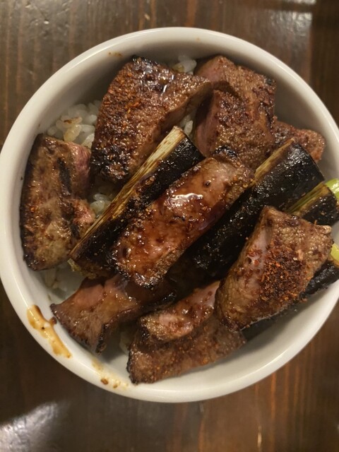 〆のレバー丼 長ネギは焦げちゃった。 でも、コレはうんまいねー!