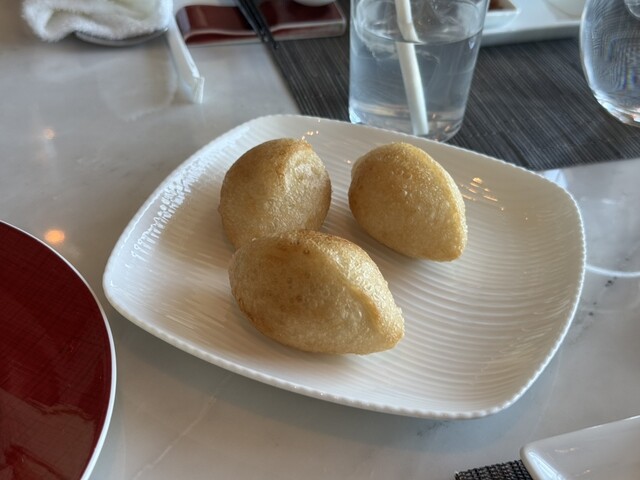 料理はどれも洗練されていて、まず印象に残ったのがスープ。一瞬驚くような海苔のスープですが、レンゲを近づけた瞬間に広がる香りがやさしく、それでいて旨味がしっかりしていて思わずため息が出るほど。点心は皮の薄いもちもちタイプが多く、小籠包は噛んだ瞬間にスープがじゅわっとあふれ、海老蒸し餃子はプリッとした弾力とシャリっとした野菜の組み合わせが心地よい食感でした。巻物系は特に完成度が高く、具材がぎゅっと詰まっているのに重く感じず、香りのバランスも良かったです。