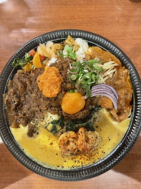 スープカレーとすき焼き肉ご飯1500円+黒毛和牛変更300円で1800円。