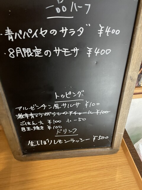 カンボジアカレー2種あいがけ(鮎の塩辛ココナッツカレー&カンポットペッパービーフキーマ)2100円。そして今日も最高気温35℃以上の猛暑割。なので黒板メニューのアルゼンチン風サルサをお願いしました。