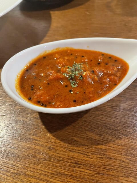 トマトとイカ墨のチキンビンダルーとラッサムをチョイス。