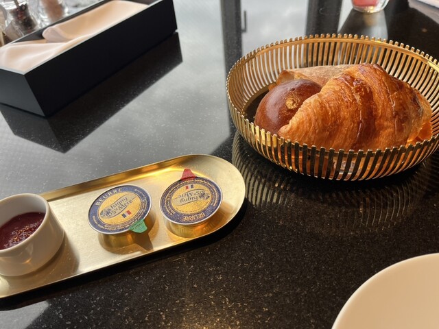 パンはバスケットで持ってきてくれて選びます。私はクロワッサン、レーズンパン。妻はバゲットをとりました。