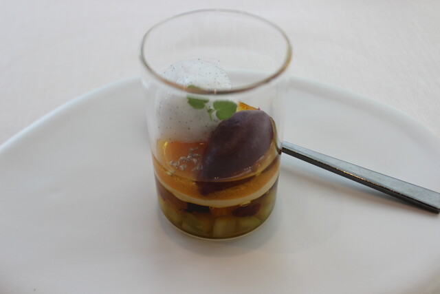 シャインスカットをはじめとした色々なフルーツとアルコールが効いたソース、巨峰のソルベをまぜて頂きます。 混ぜていただきましたが、色々な味が絡み合ってなんとも言えない美味しさ・・・