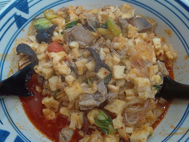 真っ赤な油が浮いたスープは見た目ほど辛くはなく、ほんのり酸っぱしょっぱいおだやかな味。