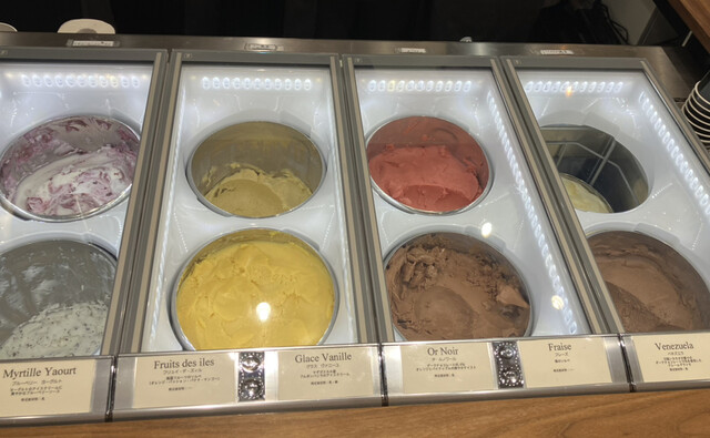 関西を代表するスイーツ店ラベニューさんのチョコ、アイスのテイクアウト店です(パンなども少し扱っています)。その他、季節に応じてスイーツを提供頂けます。この月はクレープです。クレープは大きく3種類あり、シンプルなバターと赤砂糖(550円)、マンゴー、オレンジ、パイナップルなどフルーツ系(アイス無:1320円、アイス有:1650円)、ダークチェリーとバナナソテーのチョコレート系(アイス無:1320円、アイス有:1650円)です。アイスは10種類から選択でき、今回はフルーツ系にはマダガスカル産バニラを、チョコレート系には、オレンジパイナップルのダークチョコの2種類のアイス有りのクレープを頂きました。まずクレープ生地はバターたっぷりで厚くボリュームがあります。一般的なクレープ生地の倍くらいのボリュームに感じます。中にはフルーツやクリームだけでなく、クッキーやナッツ、ポップコーンショコラなど間違いなく異次元の贅沢な大人のクレープです。初夏にぴったりの冷たさに、各所から色々な甘さと酸味が現れ複雑に絡み合います。もはやクレープの域を超えて、新たなジャンルのようです。