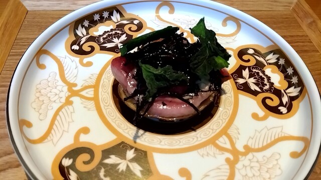 ●蒸焼きした原木椎茸 軽く塩でしめたホシガツオ 乾燥させたレモングラス軽く燻し ひじき(桜島) オカノリ セージバター