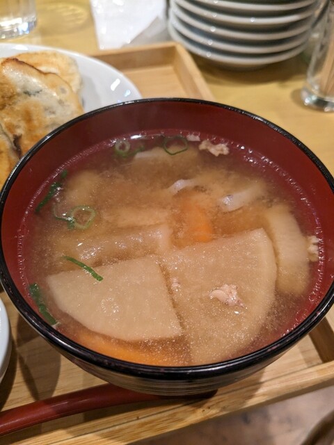 『餃子定食』は餃子8個にもやしのナムルが添えられ、ライス・豚汁・漬物が付いた定食です。