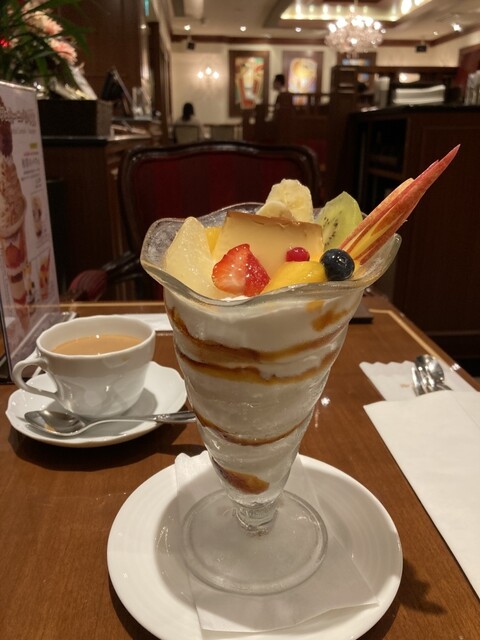 ホットコーヒーとプリンアラモードのパフェを注文。