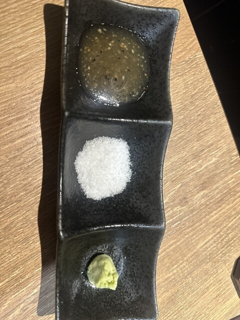 とっても柔らかくて、盛り付けもとてもおしゃれです。塩・わさび、オリジナルタレ、3種類好きなものでたべます。私は塩とわさびです。本当に美味しいです。