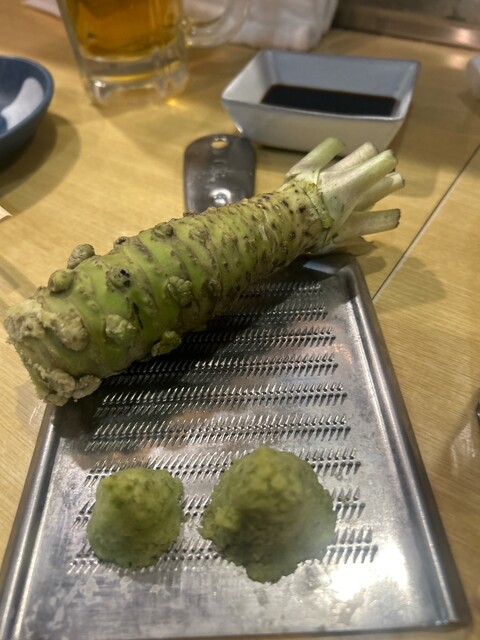 そして、ワサビもする前のワサビが出てくる。ワサビ醤油ではなく醤油をつけてからワサビをのせるのがミソとのことです。