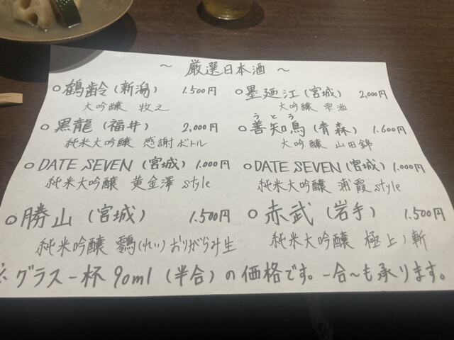 自分は1000円の福田と少しリーズナブルな楯野川を注文。サッパリ系が良いと伝えたらこちらを勧められました。