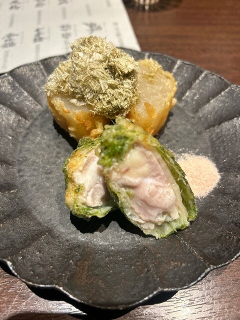 これだけでお酒が飲み続けれる前菜。この日は胸肉とマグロの瞬間揚げと甘エビ。もう1セット欲しい!!