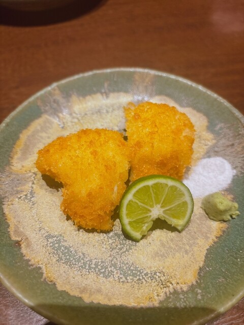 ポテサラは貝柱と卵のポテサラ。オニオンを焦がしたようなのが乗っており、通常のポテサラとの違いを出しており非常に美味しい。過去に食べたポテサラで一番とは言わないけど3番目ぐらいに美味しい^ ^