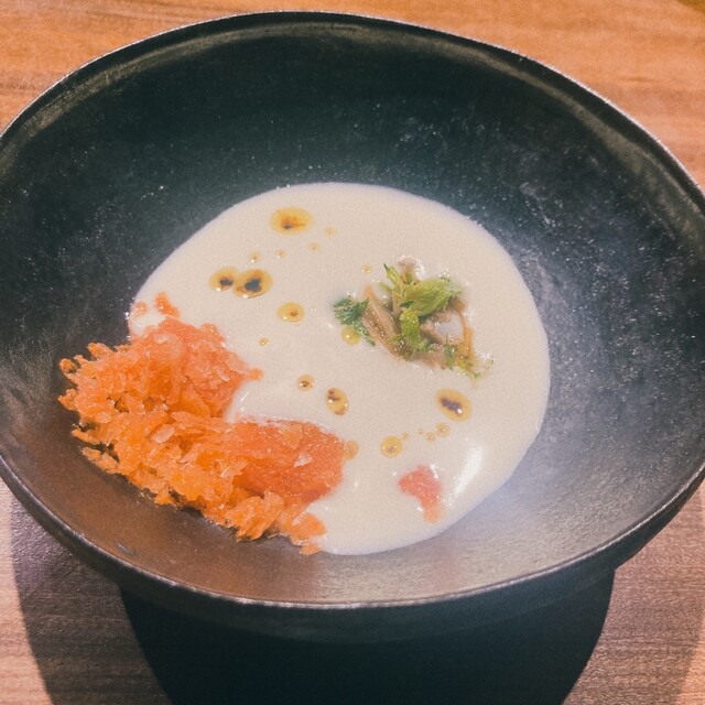 塩と番茶とサーモンの皮など意外な組み合わせを合わせまくる。どうなるかと思いきや料理としてまとまっている。