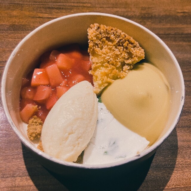 カレーとセロリの味が最初はしましたがグラニテが溶けるにつれて混ざることで甘さと旨味が生まれます。