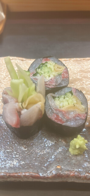 珍しくご飯のない海苔巻き。見た目も綺麗。きゅうりと食べてサッパリといけます。感覚的には少し生春巻きっぽさがあるかな?