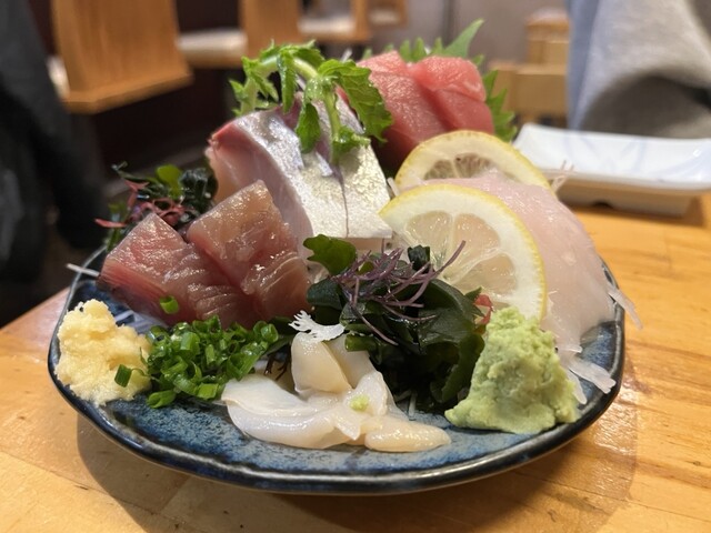 今日の刺身は、マグロ・ぶり・カツオ・おじさん・イワシの5点盛り。高知産かな。どれも美味しいです。