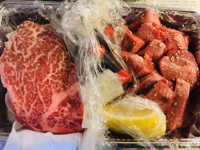 いつものパターンで、特選和牛三種盛合せ3024円(税込)と厚切りタン塩1166円(税込)×2をテイクアウトでいただきました。