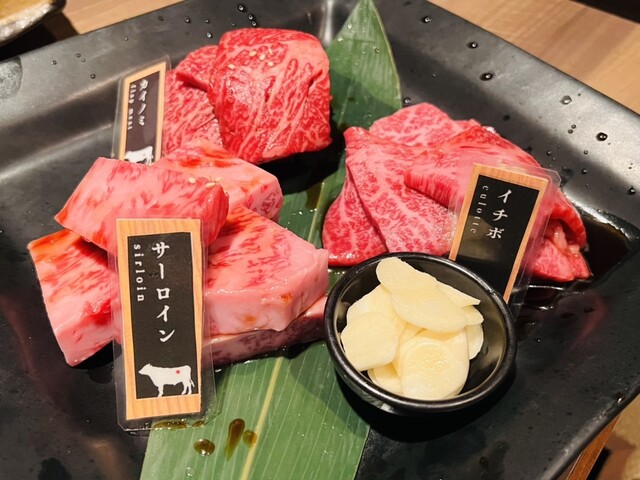 サーロイン・イチボ・カイノミの特選和牛三種盛合せ3,278円(税込)×3、シャトーブリアン200g(3,400円/100g(税込))、厚切りタン塩1,628円(税込)×2などをいただきました。
