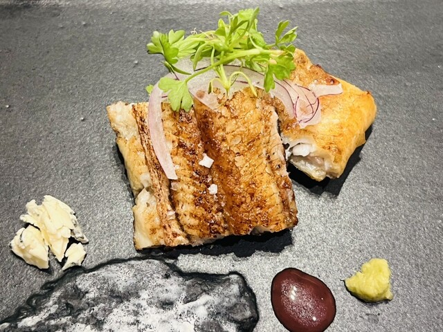 鰻の上には紫玉ねぎのスライスなどの野菜が乗っており、アクセントにはフランスのブルーチーズを使ったソースがかかっています。
