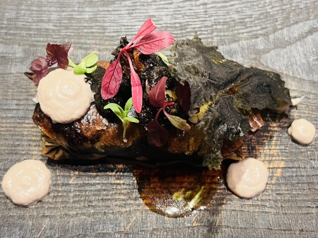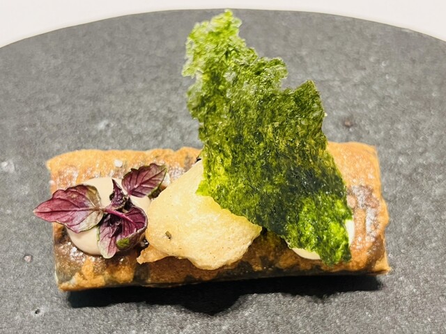 岩手三陸産の牡蠣を、低温のオイルバスで火入れを行った後に揚げ茄子と合わせてほうれん草と海苔、とうもろこしの皮などで包んで揚げ焼きした料理です。