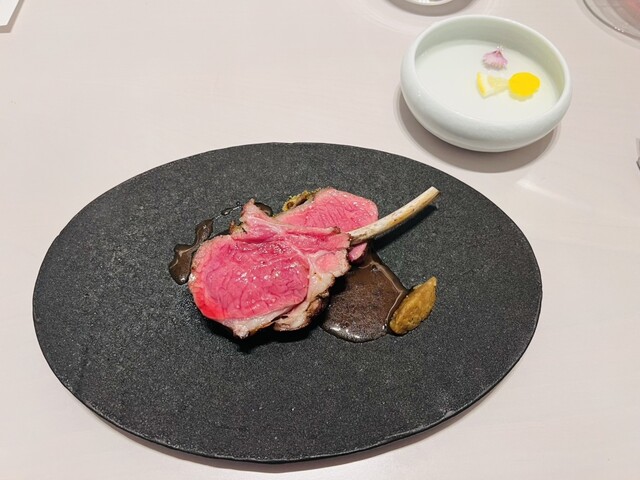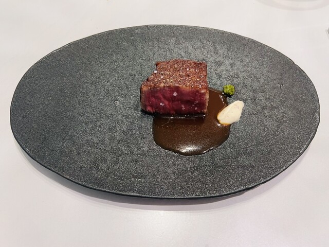 ソースは肉の出汁を煮詰めたソースで、フロマージュブランを使った爽やかなクリームとスダチ胡椒が添えられています。
